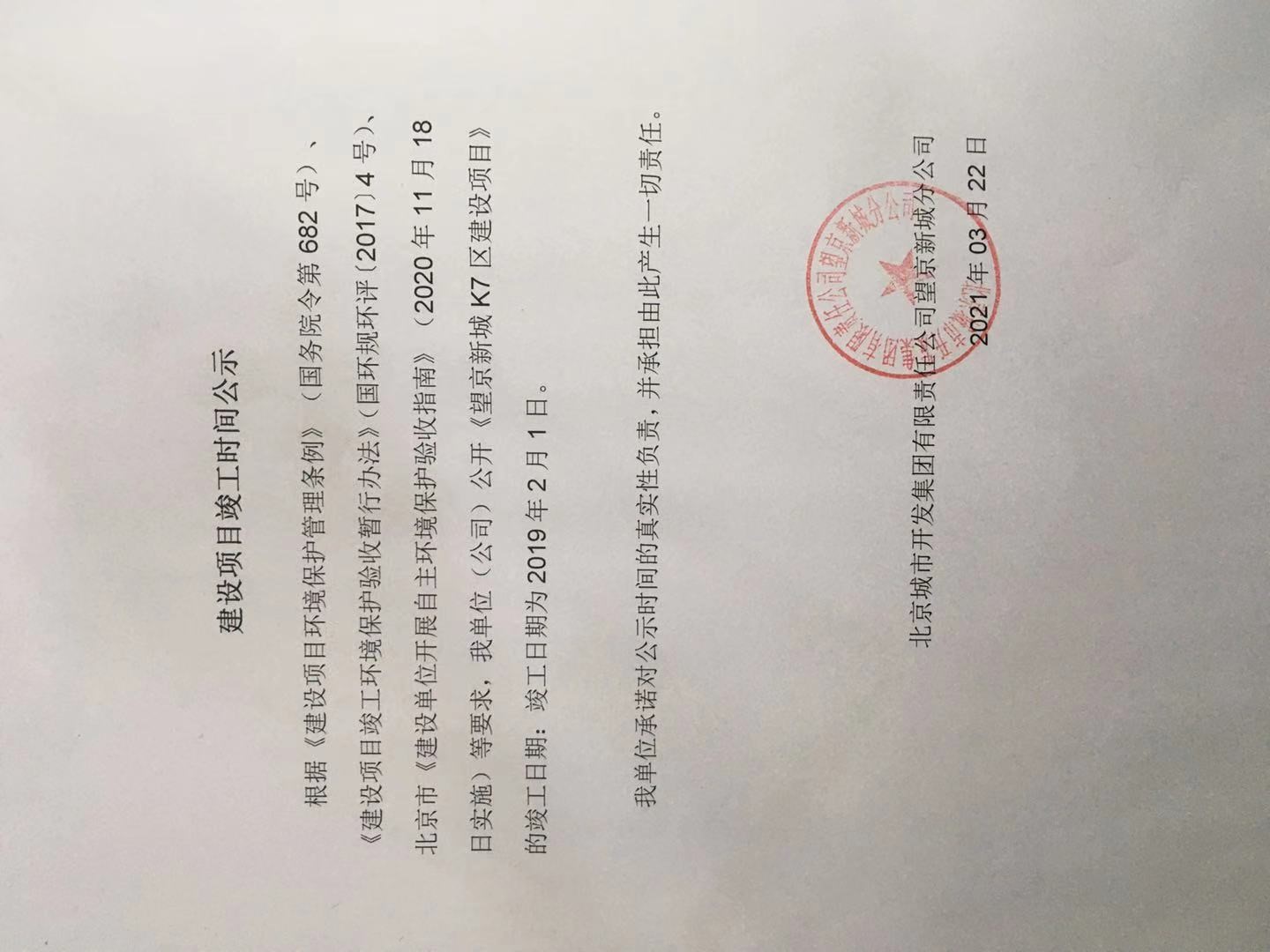 關于北京城市開發集團有限責任公司望京新城分公司《望京新城K7區建設項目》竣工時間的公示